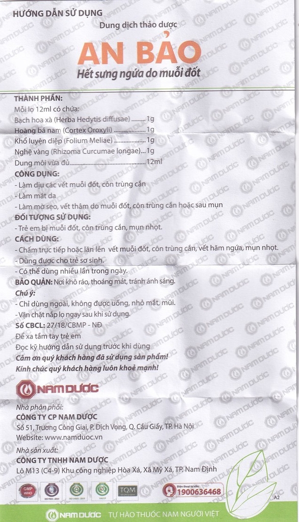 Dung dịch thảo dược An Bảo được sản xuất và phân phối bởi Công ty Cổ phần Nam Dược. Công ty Cổ phần Nam Dược thành lập năm 2004, là đơn vị uy tín tại Việt Nam sở hữu nhà máy và công nghệ chiết xuất hiện đại đạt chuẩn GMP, vùng trồng dược liệu sạch chuẩn GACP của Tổ chức Y tế Thế giới. Với định hướng phát triển dựa trên tinh hoa y học cổ truyền và tiềm năng dược liệu Việt Nam, kết hợp máy móc hiện đại, Nam Dược đã sáng tạo những sản phẩm an toàn, tiện dụng, mang lại lợi ích cho sức khỏe cộng đồng, góp phần nâng cao sức khỏe toàn dân tộc.