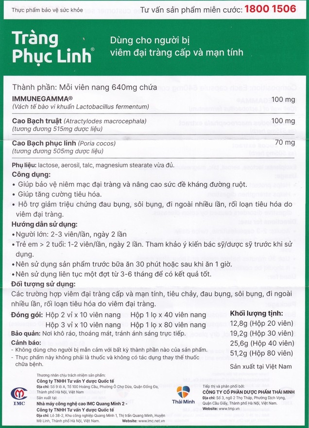 Tràng Phục Linh giúp tái tạo niêm mạc đại tràng bị tổn thương và cân bằng hệ vi khuẩn có ích cho đường ruột, tăng cường sức khỏe hệ tiêu hóa. Sản phẩm thích hợp dùng cho người viêm đại tràng cấp và mạn tính, đau bụng, tiêu chảy, đi ngoài nhiều lần hay rối loạn tiêu hóa do viêm đại tràng.